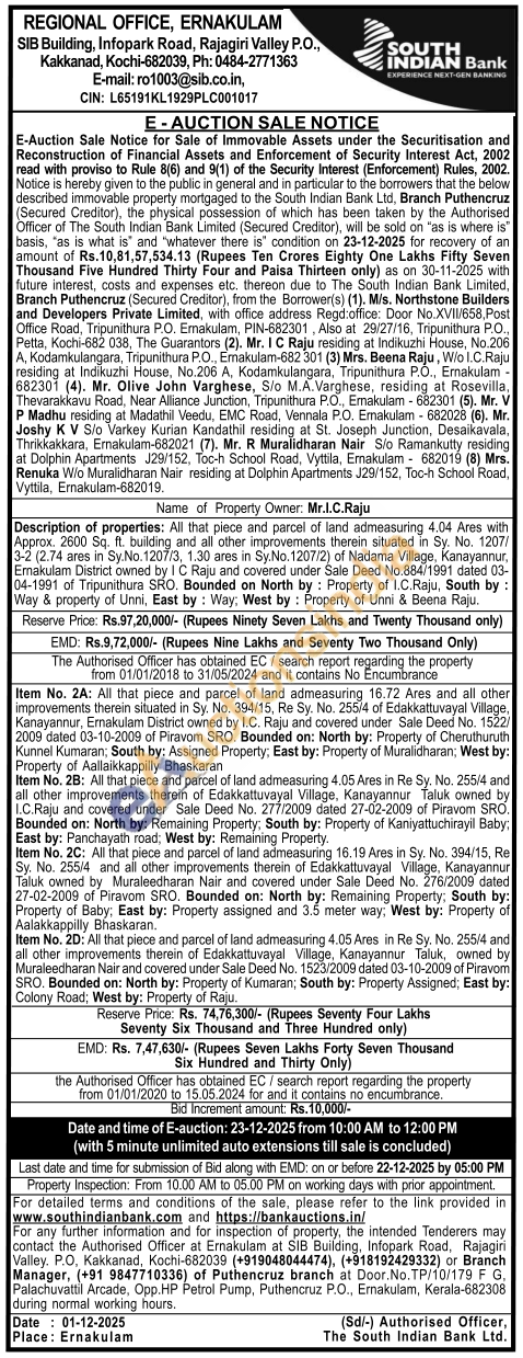 improvements therein situated in Sy. No. 394/15, Re Sy. No. 255/4 of Edakkattuvayal Village, Kanayannur, Ernakulam District owned by I.C. Raju and covered under Sale Deed No. 1522/2009 dated 03-10-2009 of Piravom SRO. Bounded on: North by: Property of Cheruthuruth Kunnel Kumaran; South by: Assigned Property, East by: Property of Muralidharan; West by: Property of Aallaikkappilly Bhaskaran Item No. 2B: All that piece and parcel of land admeasuring 4.05 Ares in Re Sy. No. 255/4 and all other improvements therein of Edakkattuvayal Village, Kanayannur Taluk owned by I.C.Raju and covered under Sale Deed No. No. 277/2009 dated 27-02-2009 of Piravom Bounded on: North by: Remaining Property: South by: Property of Kaniyattuchirayil Baby, East by: Panchayath road; West by: Remaining Property