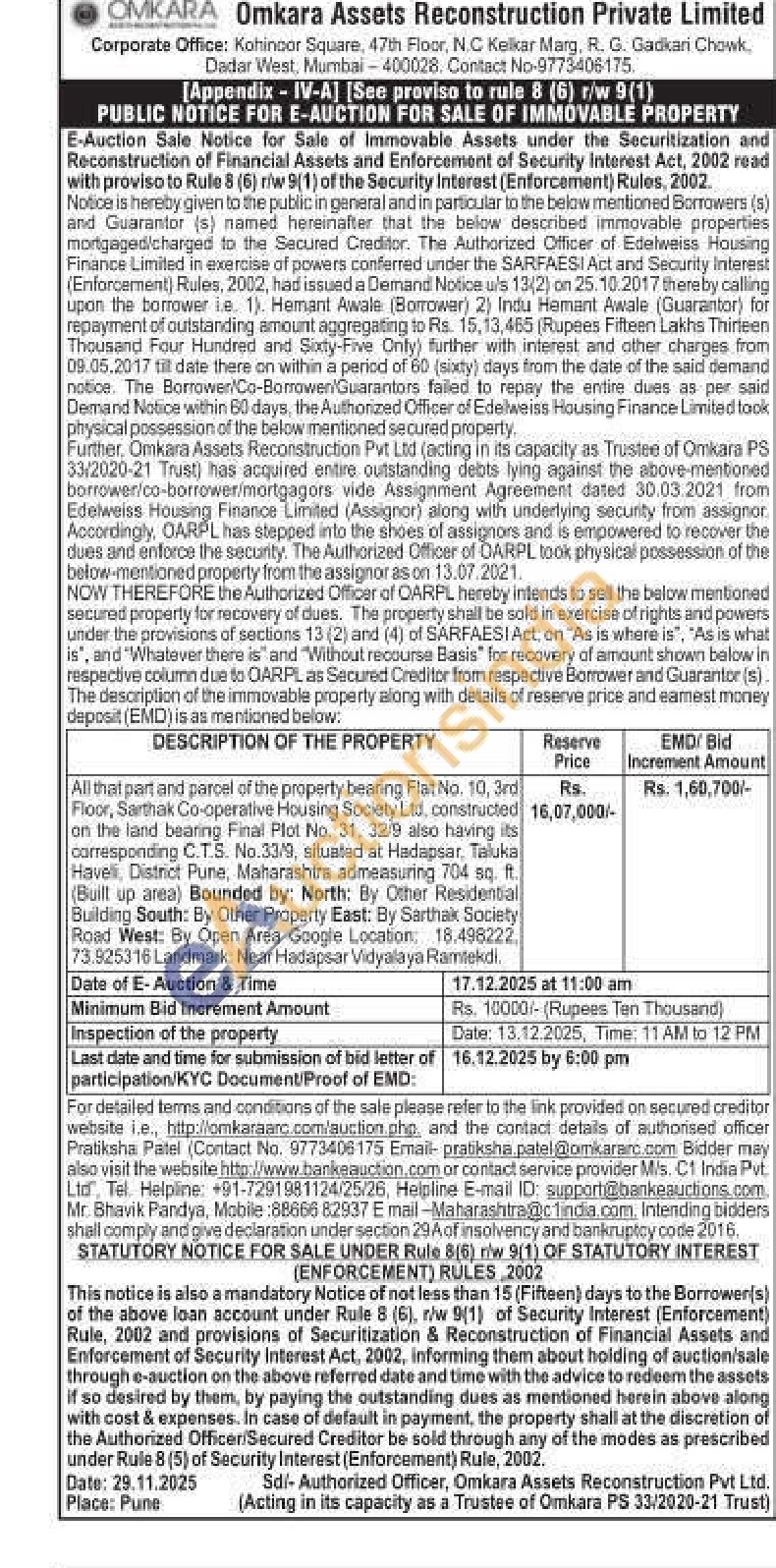 All that part and parcel of the property bearing Flat No. 10, 3rd Floor, Sarthak Co-operative Housing Society Ltd, constructed on the land bearing Final Plot No. 31, 32/9 also having its corresponding C.T.S. No.33/9, situated at Hadapsar, Taluka Haveli District Pune, Maharashtra admeasuring 704 sq. ft. (Built up area) Bounded by: North: By Other Residential Building South: By Other Property East: By Sarthak Society Road West: By Open Area Google Location, 18.498222 73.925316 Landmark: Near Hadapsar Vidyalaya Ramtekdi