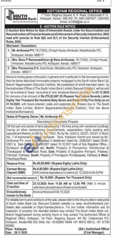 All that part and parcel of land admeasuring 7.45 Ares along with residential buildings having all other constructions, improvements, easementary rights existing and appurtenant thereon in Old Sy. No. 155/2, Re Sy No. 522-2-2, 522/21, 522/27 in Block No. 7 of Ayamanam Village, Kottayam Taluk, Kottayam District and owned by Mr. Anilkumar PV, more fully described in Settlement Deed No. 2296/2001 dated 29-06-2001 & Sale Deed No. 3458/2001 dated 15.10.2021 both of Sub Registrar Office-Kottayam and bounded on; North: Property of Ponnamma, Ashokkumar & Thankappan & Panchayat Road, East: Property of Augustine Peringolil, Pradeep, Panchall, Pathway, South: Property of Ponnappan Pichakappally, Pathway & West: Panchayat Road