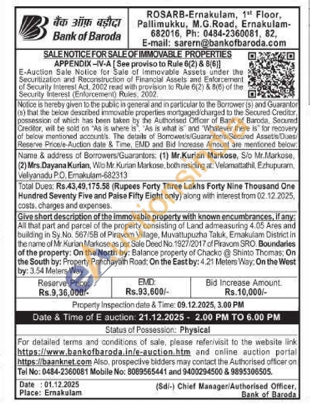 All that part and parcel of the property consisting of Land admeasuring 4.05 Ares and building in Sy. No. 567/5B of Piravom Village, Muvattupuzha Taluk, Emakulam District in the name of Mr. Kurian Markose as per Sale Deed No. 1927/2017 of Piravom SRO. Boundaries of the property: On the North by: Balance property of Chacko @ Shinto Thomas; On the South by: Property Panchayath Road; On the East by: 4.21 Meters Way, On the West by: 3.54 Meters Way