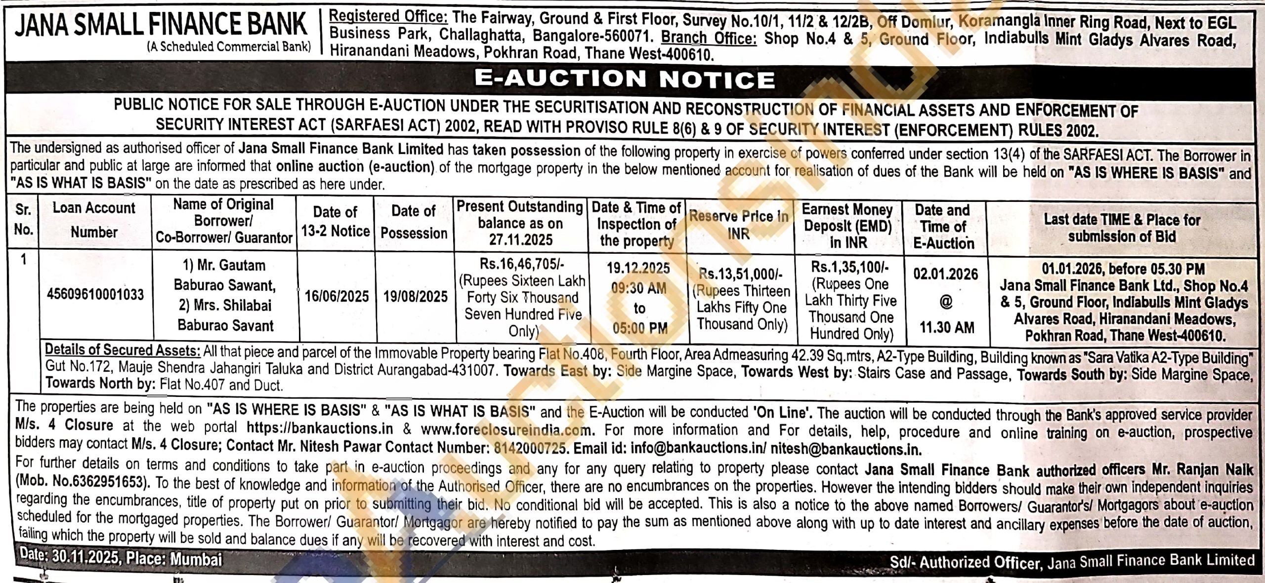 All that piece and parcel of the Immovable Property bearing Flat No.408, Fourth Floor, Area Admeasuring 42.39 Sq.mtrs, A2-Type Building, Building known as "Sara Vatika A2-Type Building" Gut No.172, Mauje Shendra Jahangiri Taluka and District Aurangabad-431007. Towards East by: Side Margine Space, Towards West by: Stairs Case and Passage, Towards South by: Side Margine Space, Towards North by: Flat No.407 and Duct