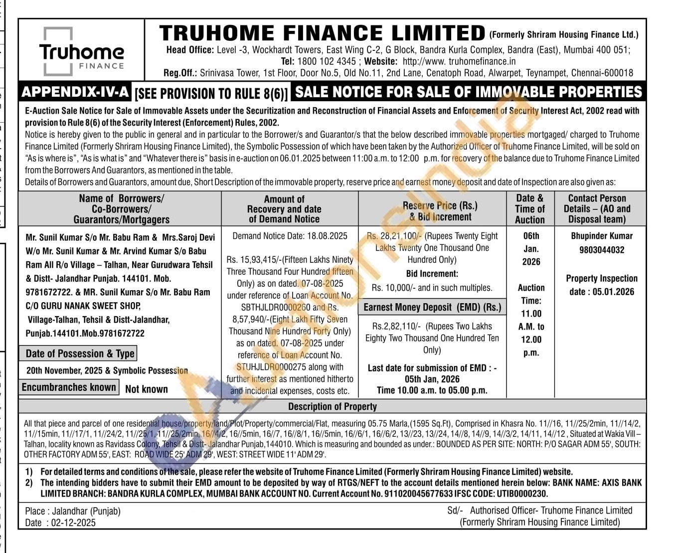 All that piece and parcel of one residential house/property/land/Plot/Property/commercial/Flat, measuring 05.75 Marla, (1595 Sq. Ft), Comprised in Khasra No. 11//16, 11//25/2min, 11//14/2, 11//15min, 11//17/1, 11//24/2, 11//25/1, 11//25/2min, 16//4/2, 16//5min, 16//7, 16//8/1, 16//5min, 16//6/1, 16//6/2, 13//23, 13//24, 14//8, 14//9, 14//3/2, 14/11, 14//12, Situated at Wakia Vill-Talhan, locality known as Ravidass Colony, Tehsil & Distt-Jalandhar Punjab, 144010. Which is measuring and bounded as under.: BOUNDED AS PER SITE: NORTH: P/O SAGAR ADM 55, SOUTH: OTHER FACTORY ADM 55, EAST: ROAD WIDE 25' ADM 29', WEST: STREET WIDE 11' ADM 29'.