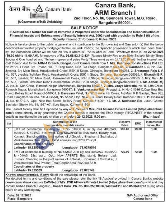EMT of commercial building at D No 51/936 G in Sy nos 403/2A3, 404B/2C & 404/A3, 51st ward. Opp NewAPSRTS Bus stand, Bellary road, Kurnool. Standing in the joint names of J Gopal, J Bhaskar, J Sudhakar, J Venkateswara Ravi Prasad. Land admeasuring 3702.28 sq ft