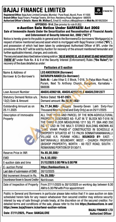 ALL THAT PIECE AND PARCEL OF THE NON-AGRICULTURAL PROPERTY DESCRIBED AS- FLAT IN 'E' BLOCK NO-T-016 IN THE THIRD FLOOR MEASURING 1211 SQ. FT. SBA AND 250 SQ. FT. USD IN THE MULTI STORED BUILDING KNOWN AS "LAKE VIHAR PHASE-II" CONSTRUCTED IN SCHEDULE A PROPERTY SITUATED AT T.C PALYA SONNATHAMANAHALLI VILLAGE K.R. PURAM HOBLI. BOUNDED BY- EAST: BATTARAHALLI BOUNDARY, WEST: CHURCH PROPERTY (BISHOP PROPERTY), NORTH: 60 FEET ROAD, SOUTH: -REMAINING PORTION OF SY.50/11.