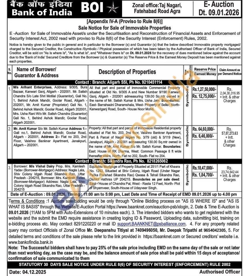 Property: All that part and parcel of immovable Residential property situated at Flat No. 203, 2nd floor, Vaishno Bankner Apartment, Part & Parcel of Nagar Nigam No. 3/79 (old) & 3/119 (New), Janakpuri, Aligarh - 202001 admeasuring 130.00 Sq.mtr owned in the name of Mr. Amit Kumar S/o Mr. Satish Kumar. Boundaries: East: House of RK Sharma, West: Common Passage 8 ft wide thereafter stairs, North- Flat no 202, South- Flat no 204.