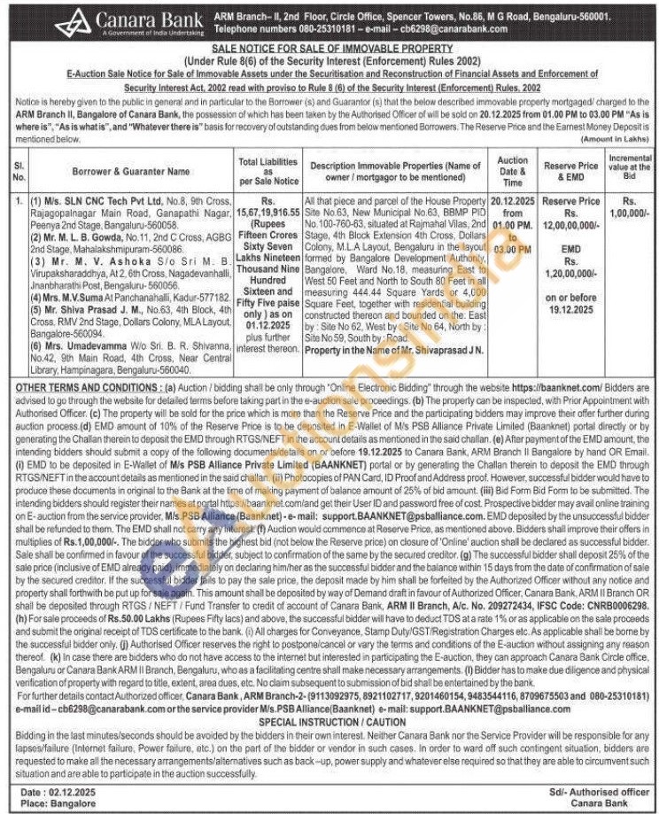 All that piece and parcel of the House Property Site No. 63, New Municipal No 63, BBMP PO No. 100-760-63, situated at Rajmahal Vilas, 2nd Stage, 4th Block Extension 4th Cross, Dollars Colony, M.LA Layout, Bengaluru in the layout formed by Bangalore Development Authority, Bangalore, Ward No. 18, measuring East to West 50 Feet and North to South 80 Feet in all measuring 444.44 Square Yards or 4,000 Square Feet, together with residential building constructed thereon and bounded on the East by Site No 62, West by: Site No 64, North by: Site No 59, South by: Road.