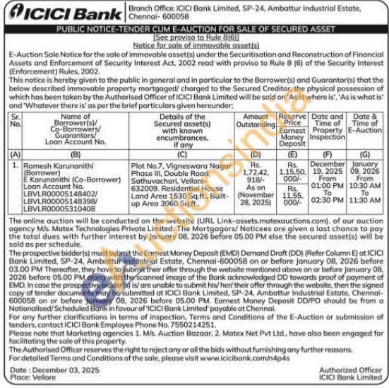 Plot No.7, Vigneswara Nagar Phase III, Double Road, Sathuvachari, Vellore-632009. Residential House Land Area 1530 Sq.ft, Built-up Area 3060 Sq.ft