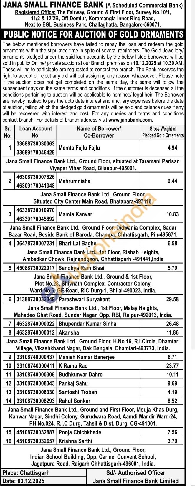 Jana Small Finance Bank Gold Auctions Auction in Bengaluru