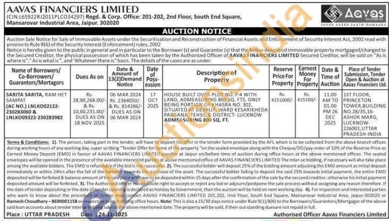 HOUSE BUILT OVER PLOT NO. P-4 WITH LAND, ADMEASURING 800 SQ. FTS. ONLY BEING PORTION OF KHASRA NO. 302. SITUATED AT DEVPUR, WARD KESARIKHEDA PARGANA, TEHSIL & DISTRICT-LUCKNOW ADMEASURING 800 SQ. FT.