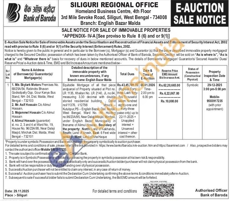 Equitable Mortgage of all that piece andparcel of Property situated at Plot no. LR 1135, Khaitan No. LR 2140, JL no.64, measuring 3.30 decimal with double storied residential building, Deed nol/11376, 1/12798 Mouza Kutubpur, PS-English Bazar, Dist. Malda, West Bengal, Ward No. 19, Holding no.96/23A/95, Near Dalaji Masjid, Mirchak, under English Bazar Municipality in thename of Alimul Hossain. Boundary of the property: North: Land of Kakhandu, South: Land of Anesh, East: 6 Feet wide passage, West: Land of Isha Haque
