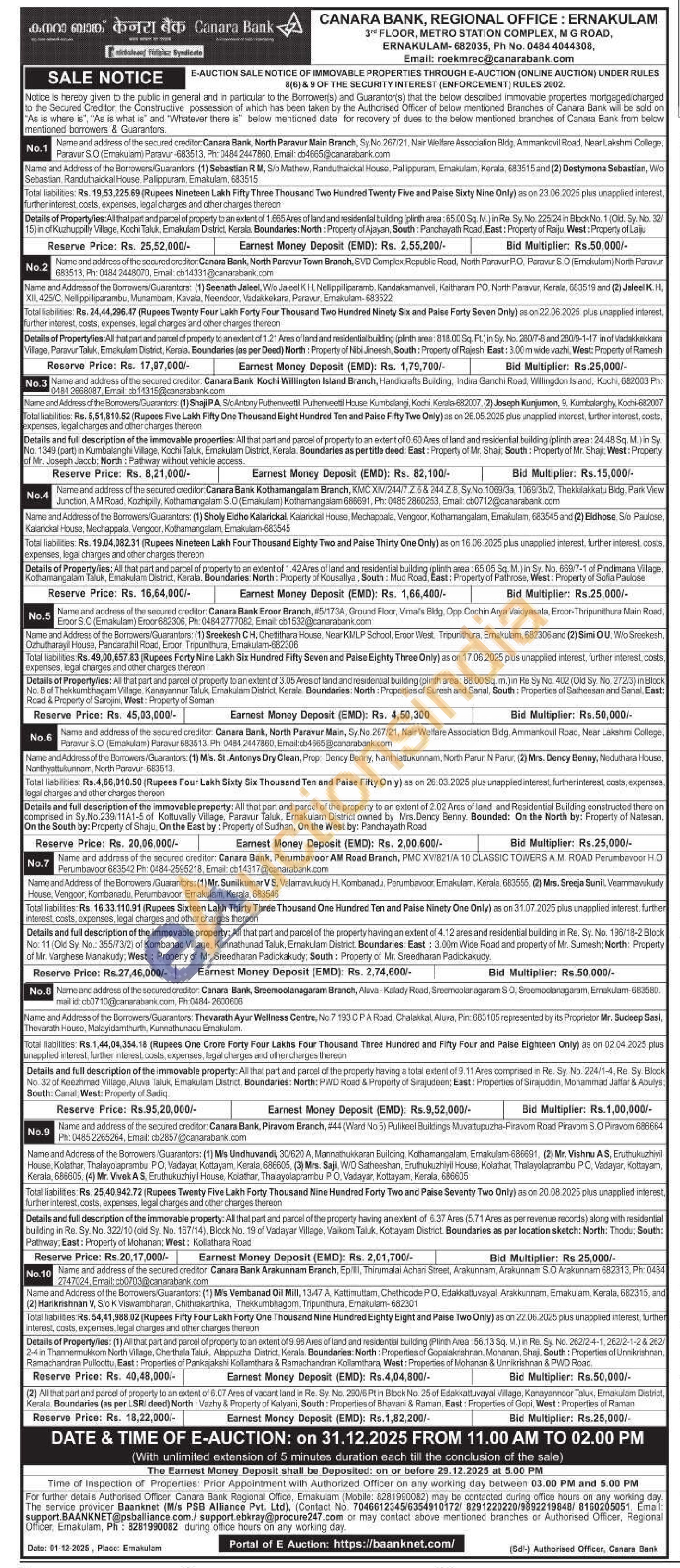 8) All that part and parcel of the property having a total extent of 9.11 Ares comprised in Re. Sy. No. 224/1-4, Re Sy. Block No. 32 of Keezhmad Village, Aluva Taluk, Emakulam District Boundaries: North: PWD Road & Property of Sirajudeen; East: Properties of Sirajuddin, Mohammad Jaffar & Abulys, South: Canal: West: Property of Sadiq