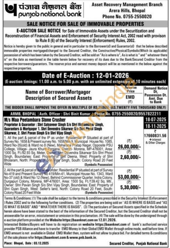 1. All the part & parcel of the IP as under: Residential IP Situated at part of Survey No. 1658 & Present survey No. 1658/Min 9, Municipal House No. 1085, Ward No-35(old) & Ward no 8 (New), Maharana Pratap Nagar, Opposite PSU College, Village- Jaura Khurd Pargana, District- Morena, MP-476001, Area: 1000 Sq. Ft/92.93 Sq. Meter, Owner. Shri Devendra Sikarwar Sio Shni Phool Singh, Boundaries: East: Property of Shri Deena, West: Property of Shri Bholaram, North: Property of Shri Vijay Singh, South: Colony Road 20 Feet Wide