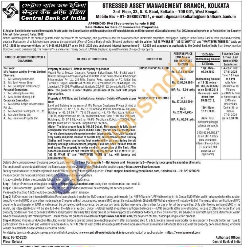 Land and Building in the name of M/s Maroon Developers Private Limited at premises no. 10, 12, 13, 14, 15, 18, 20 Acharya Prafulla Chandra (APC) Road, Holding no. 46, 53 69, 71, 72 & 73 ward no. 49. PS- Muchipara, Kolkata-700009 and premises no. 05, 06, 16 Baithak Khana Road,/1st Lane/ 2nd Lane, Holding no. 45, 67 & 68, ward no. 49, PS-Muchipara, Kolkata-700009, West Bengal. (Latitude: 22.568356; Longitude: 88.369905)(Note: The total area of land is 101.53 Cottah. This property is fully tenant occupied for more than 50 years and it is Bazar/Market place for local public. There is also chances of encroachment on this property. Tough, it is located at very costly and prime location of Kolkata City, adjacent to Sealdeah Railway Station and flyover, and having high marketability but considering the old tenancy and high encroachment, property value has been reduced from its real value. The property is under symbolic possession of the Bank. After successful auction we can transfer the property only on "AS IS WHERE IS", "AS IS WHAT IS" and "WHATEVER THERE IS" i.e. with tenancy and encroachment)