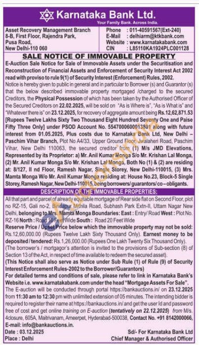 All that part and parcel of already equitable mortgage of Rear side flat on Second Floor, plot no RZ-15, Gali no-2, Bindapur Mithila Road, Subhash Park Extn-II, Uttam Nagar New Delhi, belonging to Mrs. Mamta Monga Boundaries: East: Entry/Road West: Plot No. RZ-16 North: Road 10 Feet Wide South: Road 20 Feet Wide