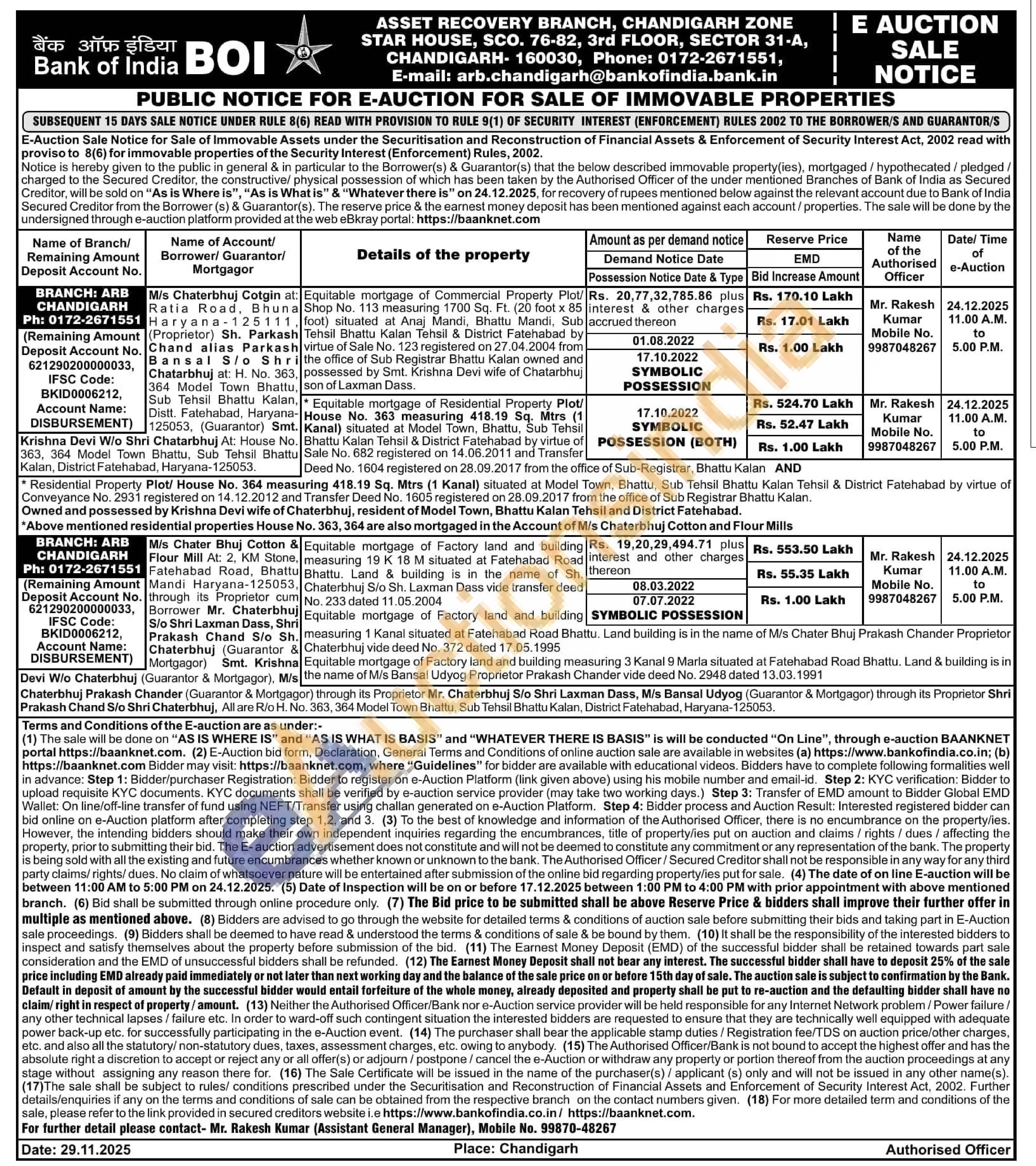 Equitable mortgage of Residential Property Plot/House No. 363 measuring 418.19 Sq. Mtrs (1) Kanal) situated at Model Town, Bhattu, Sub Tehsil Bhattu Kalan Tehsil & District Fatehabad by virtue of Sale No. 682 registered on 14.06.2011 and TransferDeed No. 1604 registered on 28.09.2017 from the office of Sub-Registrar, Bhattu Kalan ANDResidential Property Plot/ House No. 364 measuring 418.19 Sq. Mtrs (1 Kanal) situated at Model Town, Bhattu, Sub Tehsil Bhattu Kalan Tehsil & District Fatehabad by virtue of Conveyance No. 2931 registered on 14.12.2012 and Transfer Deed No. 1605 registered on 28.09.2017 from the office of Sub Registrar Bhattu Kalan. Owned and possessed by Krishna Devi wife of Chaterbhuj, resident of Model Town, Bhattu Kalan Tehsil and District Fatehabad.