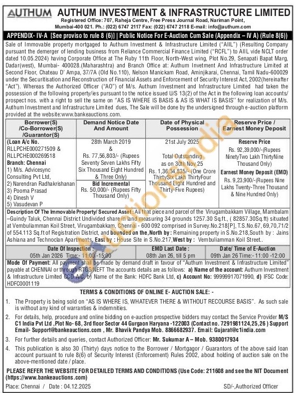 Description Of The Immovable Property/ Secured Asset: All that piece and parcel of the Virugambakkam Village, Mambalam -Guindy Taluk, Chennai District Undivided share in land measuring 34 grounds 1257.30 Sq.ft., (82857.30Sq.ft) situated at Vembuliamman Koil Street, Virugambakkam, Chennai-600 092 comprised in Survey. No.218[P], T.S.No.67, 69,70,71/2 of 554.113 Sq.ft of Registration District, and bounded on the, North by: Remaining property in S.No.218, South by: Jains Ashiana and Technoclan Apartments, East by: House Site in S.No.217, West by: Vembuliamman Koil Street..