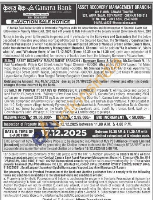DETAILS OF PROPERTY: STATUS OF POSSESSION: SYMBOLIC: Property 1: All that piece and parcel of land Flat No F1(carpet area-740 sq ft) First Floor Kasi Flats D no 1A, Canara Bank colony measuring 2994 soft as per document (2859.718 sq.ft as per survey) bearing Door No 1, Canara Bank colony, Saligaramam, Chennai comprised in Survey Nos 9/1 and 9/2, New survey Nos. 9/3 and 9/6 as perPatta No. 1590 situated at No.110, Saligramam village, formerly Egmore Nungambakkam taluk, Presently in Mambalam Taluk, Chennai District and being bounded on the North by Dhandapalani's land, South by Uma's land, East by: Govindasami's Land, West by: 10 Feet wide Passage & Land belongs to pushpa