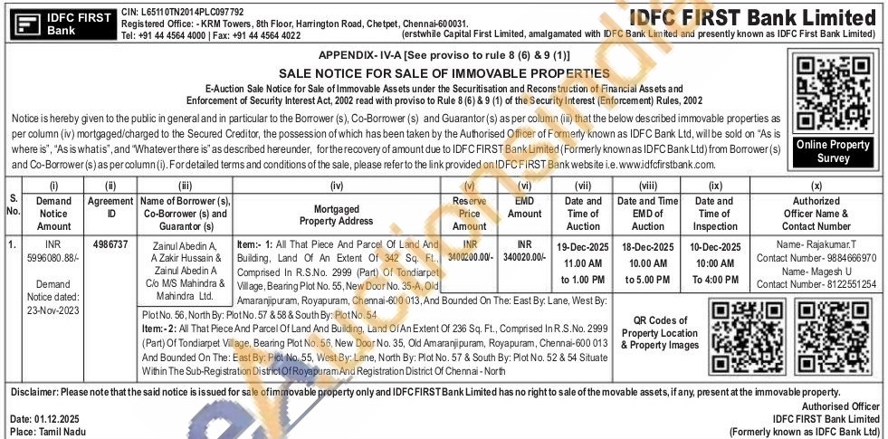 Item:- 1: All That Piece And Parcel Of Land And Building, Land Of An Extent Of 342 Sq. Ft., Comprised In R.S.No. 2999 (Part) Of Tondiarpet Village, Bearing Plot No. 55, New Door No. 35-A, OldAmaranjipuram, Royapuram, Chennai-600 013, And Bounded On The: East By: Lane, West By: Plot No. 56, North By: Plot No. 57 & 58 & South By: Plot No. 54 Item:-2: All That Piece And Parcel Of Land And Building, Land Of An Extent Of 236 Sq. Ft., Comprised In R.S.No. 2999 (Part) Of Tondiarpet Village, Bearing Plot No. 56, New Door No. 35, Old Amaranjipuram, Royapuram, Chennai-600 013 And Bounded On The: East By: Plot No. 55, West By: Lane, North By: Plot No. 57 & South By: Plot No. 52 & 54 Situate Within The Sub-Registration District Of Royapuram And Registration District Of Chennai-North