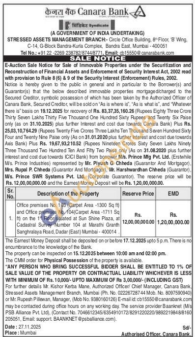 Office premises No. 103 (Carpet Area -1300 Sq ft) and Office premises No. 104(Carpet Area -1711 Sq 1. ft) on the 1 Floor situated at Sun Shine Plaza, at Cadastral Survey Number 104 at Marathi Granth Sanghralaya Road, Dadar (East) Mumbai-400014