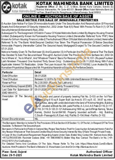 All that piece and parcel of property bearing Flat No. D-103 on the 1st Floor Admeasuring 6.15 sqft Super Built Up Area & 373 sqft. LE 34.67 sq mir Builtup Area, along with undivided share in the land of "Krishna Heights, Building No. D' situated at Blodi No.348, paik Plot No. A-3, A-4, A-5 Paki D-116, D-117, D-118, D-119,D-120. D-121 Admeasuring 1900 sq. yard of Moje Kamrej, Taluka Kamvej, District Surat-394180. Property bounded as North Adj. Building C. South-Passage & Lift East-Adj Flat No.D-104, West-Flat No.D-102