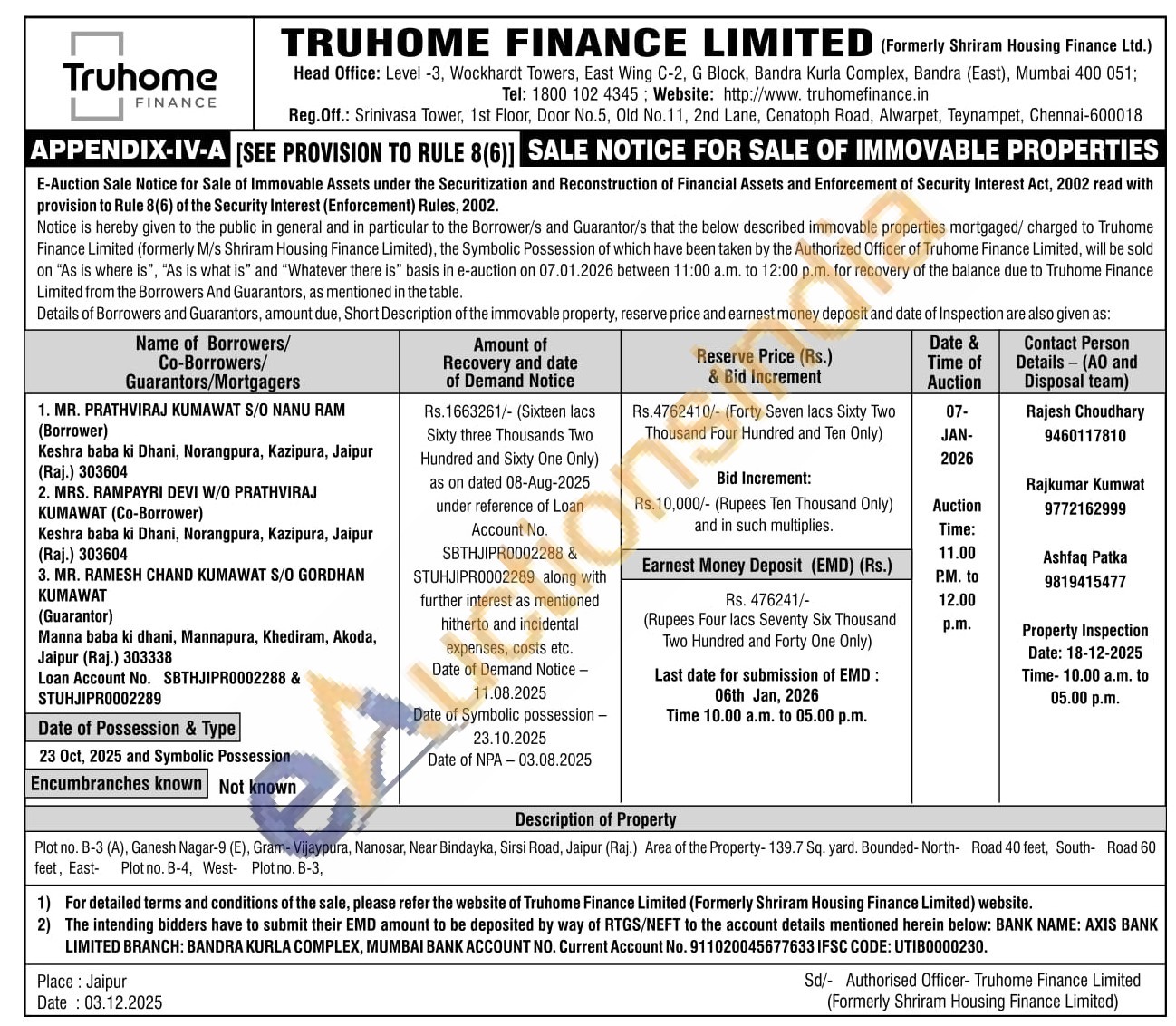 Plot no. B-3 (A), Ganesh Nagar-9 (E), Gram- Vijaypura, Nanosar, Near Bindayka, Sirsi Road, Jaipur (Raj.) Area of the Property-139.7 Sq. yard. Bounded-North Road 40 feet, South- Road 60 feet, East- Plot no. B-4, West- Plot no. B-3,