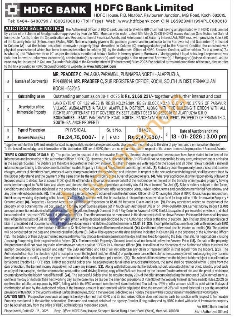 LAND EXTENT OF 1.82 ARES IN RE.SY.NO.219/28/1, RE.SY BLOCK NO.10, OLD SY, NO.377/9/2 OF PARAVUR VILLAGE, AMBALAPPUZHA TALUK, ALAPPUZHA DISTRICT, ALONG WITH THE BUILDING THEREON WITH ALL RIGHTS APPURTENANT TO IT COVERED BY SETTLEMENT DEED NO.282/2016 OF ALAPPUZHA S.R.O BOUNDARIES-EAST-PANCHAYATH ROAD, NORTH-PANCHAYATH ROAD, WEST-PROPERTY OF PRASANTH C, SOUTH-BALANCE PROPERTY
