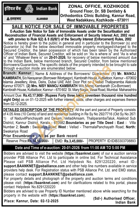 DETAILED DESCRIPTION OF THE PROPERTY: All the part and parcel of Property consists of 4.05 Ares (10 Cents) of land and residential building in Re Sy No 292/7716 (Old Sy No 267/1) of Naduvil Panchayath and Desam, VelladAmsam, Thaliparamba Taluk, Alakkod Sub District, Kannur District, Kerala 670582.Boundaries as per Title Deed: East: Villa Number 2; South: Swakariya Road; West: Vellad Thermala Panchayath Road; North: Swakariya Road