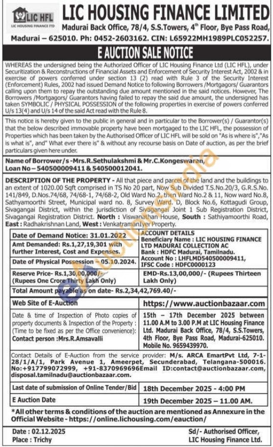 DESCRIPTION OF THE PROPERTY - All that piece and parcel of the land and the buildings to an extent of 1020.00 Sqft comprised in TS No 20 part, Now Sub Divided T.S.No.20/3, G.R.S.No. 141/849, D.Nos.74/68, 74/68-1, 74/68-2, Old Ward No.2, then Ward No.2 & 11, Now ward No.8, Sathyamoorthi Street, Municipal ward no. 8, Survey Ward. D, Block No.6, Kottagudi Group, Sivagangai District, within the jurisdiction of Sivagangai Joint 1 Sub Registration District, Sivagangai Registration District. North: Viswanathan House, South: Sathiyamoorthi Road, East: Radhakrishnan Land, West: VenkatramanIyer Property