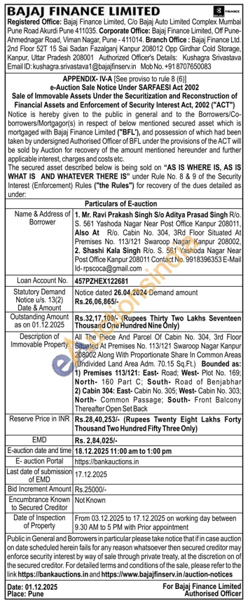 All The Piece And Parcel Of Cabin No. 304, 3rd Floor Situated At Premises No. 113/121 Swaroop Nagar Kanpur 208002 Along With Proportionate Share In Common Areas (Undivided Land Area Adm. 70.15 Sq.Ft.) Bounded as: 1) Premises 113/121: East Road: West- Plot No. 169; North- 160 Part C. South Road of Benjabhar 2) Cabin 304: East- Cabin No. 305; West- Cabin No. 303; North Common Passage; South- Front Balcony Thereafter Open Set Back