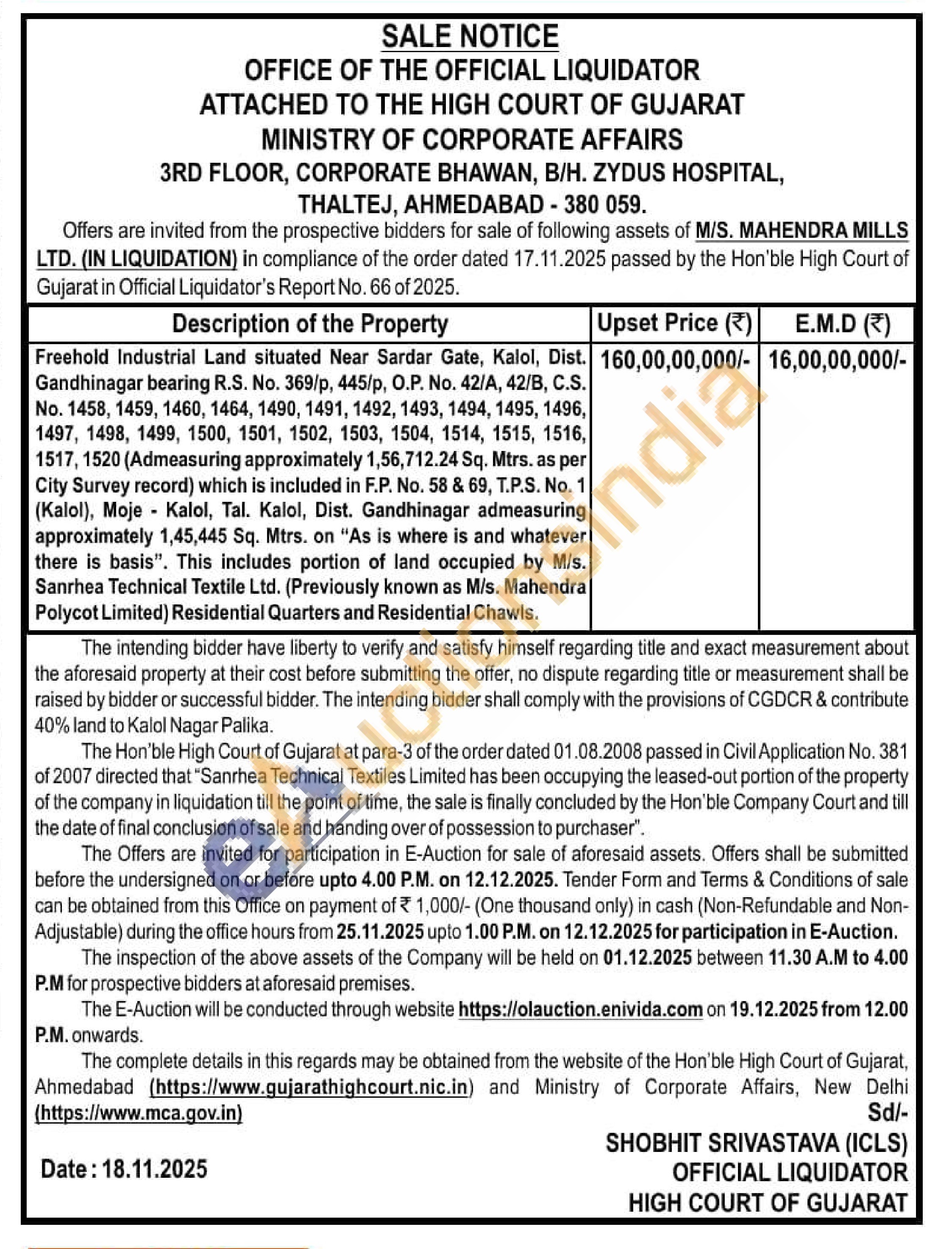 Freehold Industrial Land situated Near Sardar Gate, Kalol, Dist. Gandhinagar bearing R.S. No. 369/p, 445/p, O.P. No. 42/A, 42/B, C.S. No. 1458, 1459, 1460, 1464, 1490, 1491, 1492, 1493, 1494, 1495, 1496, 1497, 1498, 1499, 1500, 1501, 1502, 1503, 1504, 1514, 1515, 1516, 1517, 1520 (Admeasuring approximately 1,56,712.24 Sq. Mtrs. as per City Survey record) which is included in F.P. No. 58 & 69, T.P.S. No. 1 (Kalol), Moje Kalol, Tal. Kalol, Dist. Gandhinagar admeasuring approximately 1,45,445 Sq. Mtrs. on "As is where is and whatever there is basis". This includes portion of land occupied by M/s. Sanrhea Technical Textile Ltd. (Previously known as M/s. Mahendra Polycot Limited) Residential Quarters and Residential Chawls