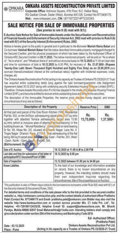 All that part and parcel of the One Room Kitchen (1RK) Residential Flat No. 302, on the 3rd floor, adimeasuring carpet area 23.07 sq.mirs together with attached Terrace admeasuring carpet area 10.80 sq.mtrs (which is inclusive area of attached terrace/balcony) in the building known as Mrunal Residency, constructed on land bearing Sr No. 49, Hisaa No. 3/2, situated at Shramik Nagar. Lane No. 4. Tingre Nagar Dhanori, Pune 411015. Total admeasuring of the fat being 364 sq.ft carpet aree. Bounded by: East-Flat No. 301, West Open, North Open, South-Flat No. 304