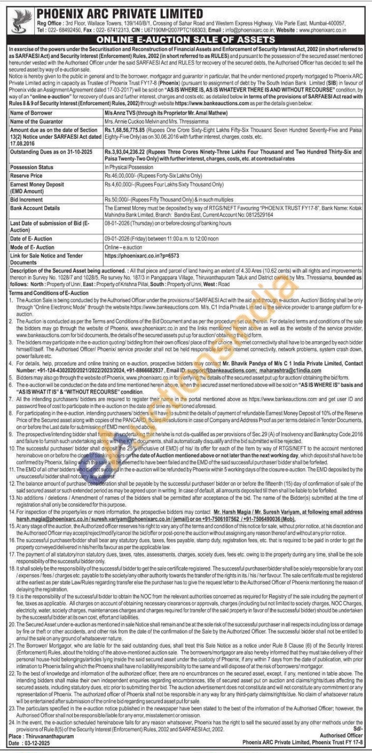 Description of the Secured Asset being auctioned.: All that piece and parcel of land having an extent of 4.30 Ares (10.62 cents) with all rights and improvements thereon in Survey No. 1028/7 and 1028/5, Re survey No. 187/3 in Pangappara Village, Thiruvanthapuram Taluk and District owned by Mrs. Thressiama, bounded as follows: North: Property of Unni, East: Property of Krishna Pillai, South: Property of inni, West: Road