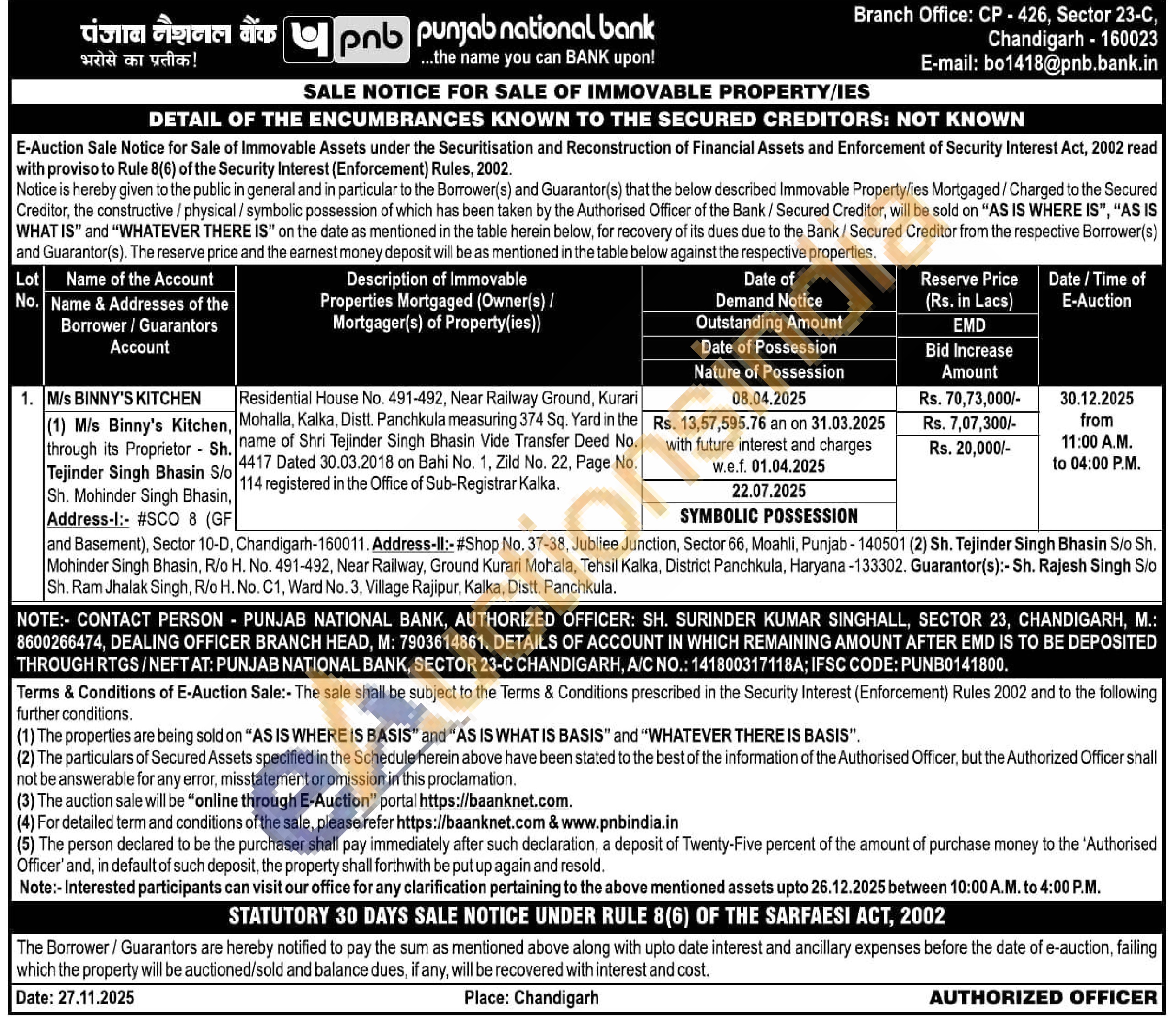 AUTHORIZED OFFICER: SH. SURINDER KUMAR SINGHALL CHANDIGARH Mobile NO : 8600266474 / DEALING OFFICER BRANCH HEAD, Mobile No : 7903614861