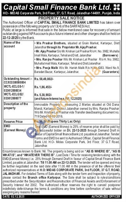 Immovable Property: measuring 2 Marlas situated at Old Dana Mandi, Kartarpur, District Jalandhar owned by Mrs. Ranjna Prashar W/o Mr. Krishan Lal Prashar vide Transfer deed bearing document no. 719 Dated-08-02-2016,