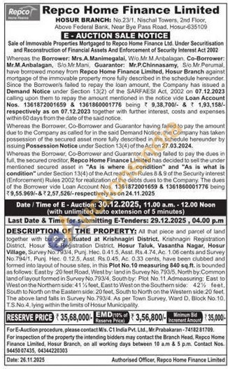 DESCRIPTION OF THE PROPERTY: All that piece and parcel of land together with building situated at Krishnagiri District, Krishnagin Registration District, Hosur Sub-Registration District, Hosur Taluk, Vasantha Nagar, Hosur Village, Survey No. 793/4, Punj. Hec. 0.41.5, Asst. Rs 4.74, Ac. 1.06 cents and Survey No.794/1, Punj Hec. 0.12.5, Asst. Rs.0.45. Ac 0.33 cents, have been clubbed and formed into layout of house sites, in this Plot No. 10 measuring 840 sq.ft. is bounded as follows: East by 20 feet Road, West by: land in Survey No. 793/5, North by:Common land of layout formed in Survey No. 793/4, South by: Plot No. 11 Admeasuring: East to West on the Northern side: 41% feet, East to West on the Southern side: 42% feet. South to North on the Eastern side: 20 teet, South to North on the Western side: 20 feet The above land falls in Survey No. 793/4. As per Town Survey, Ward D. Block No. 10. TS No. 4, lying within the limits of Hosur Municipality