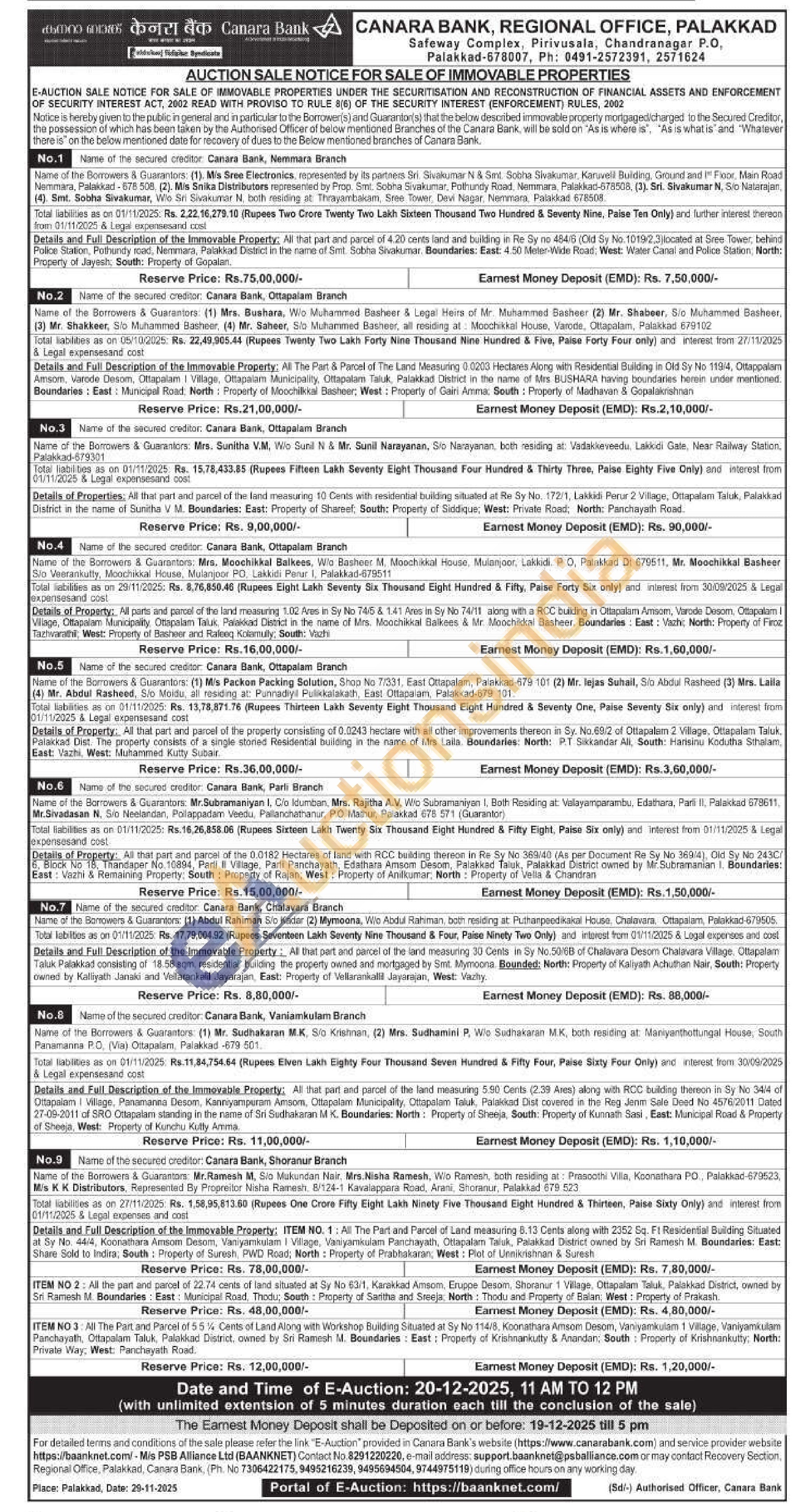 3) All that part and parcel of the land measuring 10 Cents with residential building situated at Re Sy No. 172/1, Lakkidi Perur 2 Village, Ottapalam Taluk, Palakkad District in the name of Sunitha V M. Boundaries: East: Property of Shareef South: Property of Siddique; West: Private Road; North: Panchayath Road