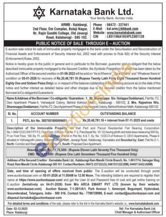 Description of the Immovable Property: All that Part and Parcel Residential Flat Bearing Corporation No.1-949/12/20/3/6/7/FF/F2, Finst Floor, (Old No. Flat No. F-2, Panchayat No. 10-12) having plinth and total area measuring 500 Sq. Ft on First Floor, 150 Sq. Ft. undivided share of land in Plot No. 6 & 7, Sy. No. 12/20/3 of Kotnoor D. DEVI Apartments, Phase-II situated in Vishwajyothi colony, Behind Kotnoor Math, Jewargi Road, Kalaburagi, Karnataka and Bounded by: East: Flat No E-1, North: Comidor and Staircase, West: Sy No. 12, South: Proposed Devi Apartment.