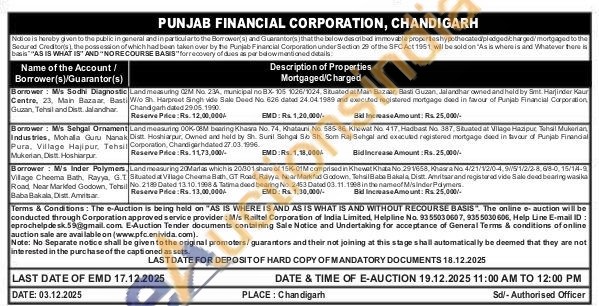 Land measuring OOK OEM bearing Khasra No. 74. Khatauni No. 585-86 Khewat No 417, Hadbast No. 387, Suated at Vilage Haapur Tahall Mukertan Distt. Hoshiarpur. Owned and held by Sh. Sunil Sehgal So Sh. Som Raj Sehgal and executed registered mortgage daid in avoir d Punjab Financial Corporation, Chandigarh