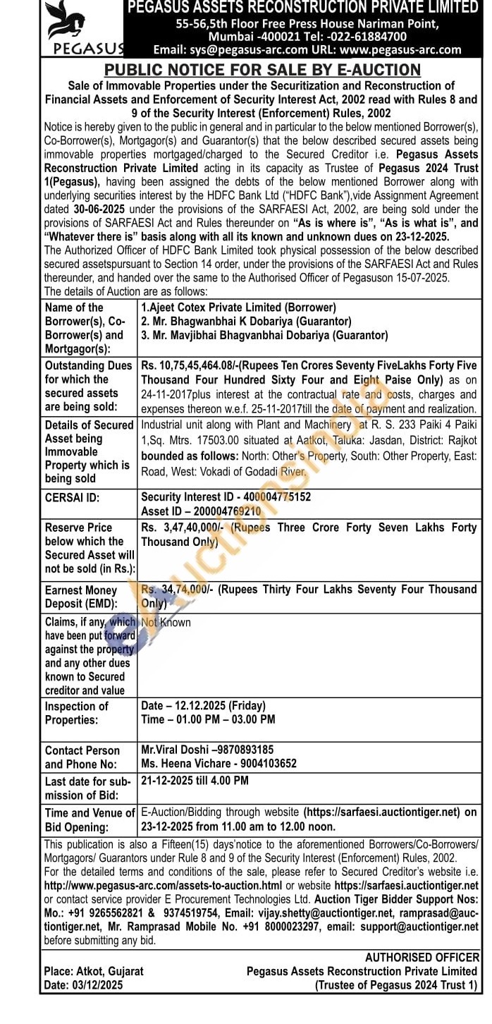 Industrial unit along with Plant and Machinery at R. S. 233 Paiki 4 Paiki 1,Sq. Mtrs. 17503.00 situated at Aatkot, Taluka: Jasdan, District: Rajkot bounded as follows: North: Other's Property, South: Other Property, East: Road, West: Vokadi of Godadi River.