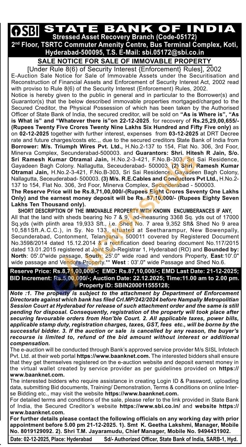 All that the land with sheds bearing No 7 & 9, ad-measuring 3368 Sq. yds out of 17000 Sq.yds (with plinth area 19,933 Sft., i.e. Shed No. 7 area 9,352 Sft& Shed No 9 area 10,581Sft.A.C.C.), in Sy. No 133, situated at Seetharampur, New Bowenpally, Secunderabad, Contonment, Telangana 500011 covered by Registered Document No.3598/2014 dated 15.12.2014 & a rectification deed bearing document No.117/2015 dated 13.01.2015 registered at Joint Sub-Registrar 1, Hyderabad (RO) and Bounded by: North: 05'.0"wide passage, South: 25'.0" wide road and vendors Property, East: 10.0" wide passage and Vendors Property.** West: 03'.0" wide Passage and Shed No.6.