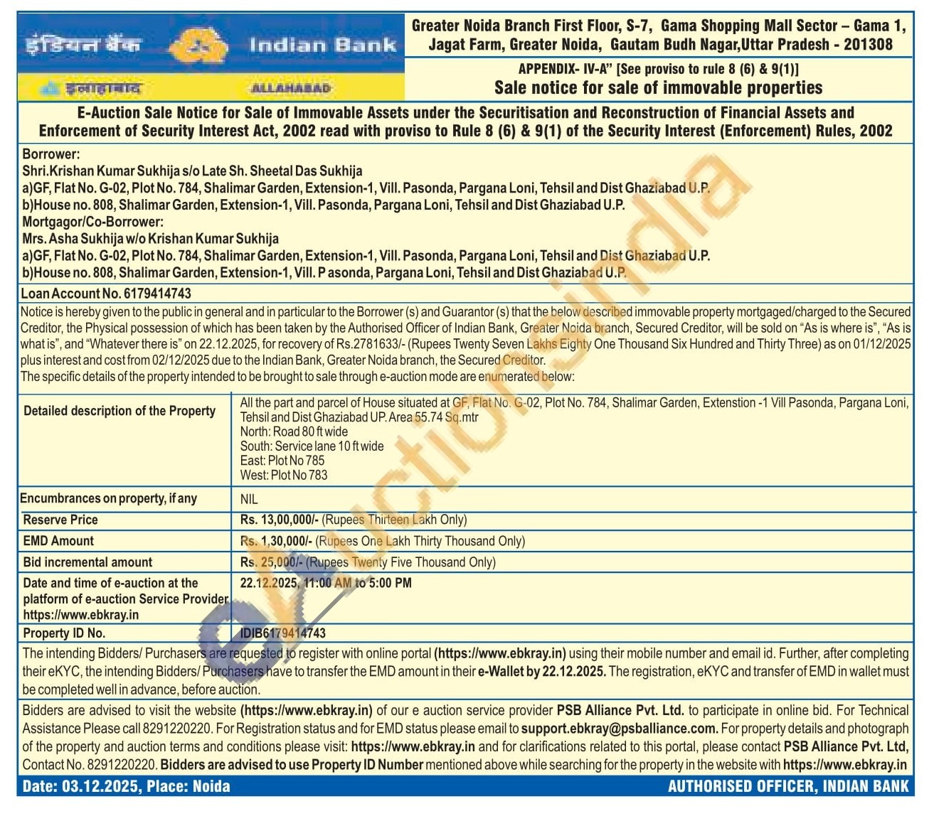 All the part and parcel of House situated at GF, Flat No. G-02, Plot No. 784, Shalimar Garden, Extenstion -1 Vill Pasonda, Pargana Loni, Tehsil and Dist Ghaziabad UP. Area 55.74 Sq.mtr