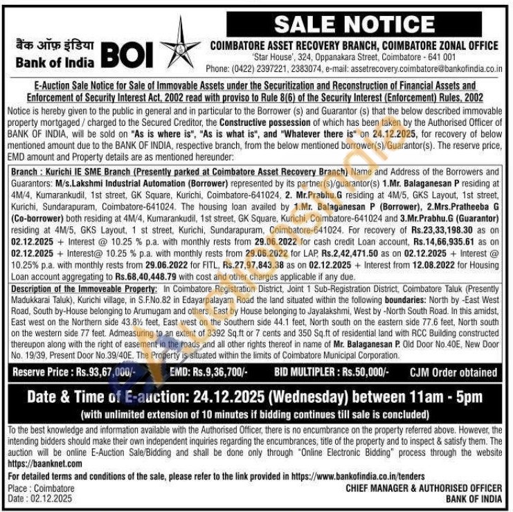 Description of the Immoveable Property: In Coimbatore Registration District, Joint 1 Sub-Registration District, Coimbatore Taluk (Presently Madukkarai Taluk), Kurichi village, in S.F.No.82 in Edayarpalayam Road the land situated within the following boundaries: North by -East West Road, South by-House belonging to Arumugam and others, East by House belonging to Jayalakshmi, West by -North South Road. In this amidst, East west on the Northern side 43.8% feet, East west on the Southern side 44.1 feet, North south on the eastern side 77.6 feet, North south on the western side 77 feet. Admeasuring to an extent of 3392 Sq.ft or 7 cents and 350 Sq.ft of residential land with RCC Building constructed thereupon along with the right of easement in the roads and all other rights thereof in name of Mr. Balaganesan P. Old Door No.40E, New Door No. 19/39, Present Door No.39/40E. The Property is situated within the limits of Coimbatore Municipal Corporation