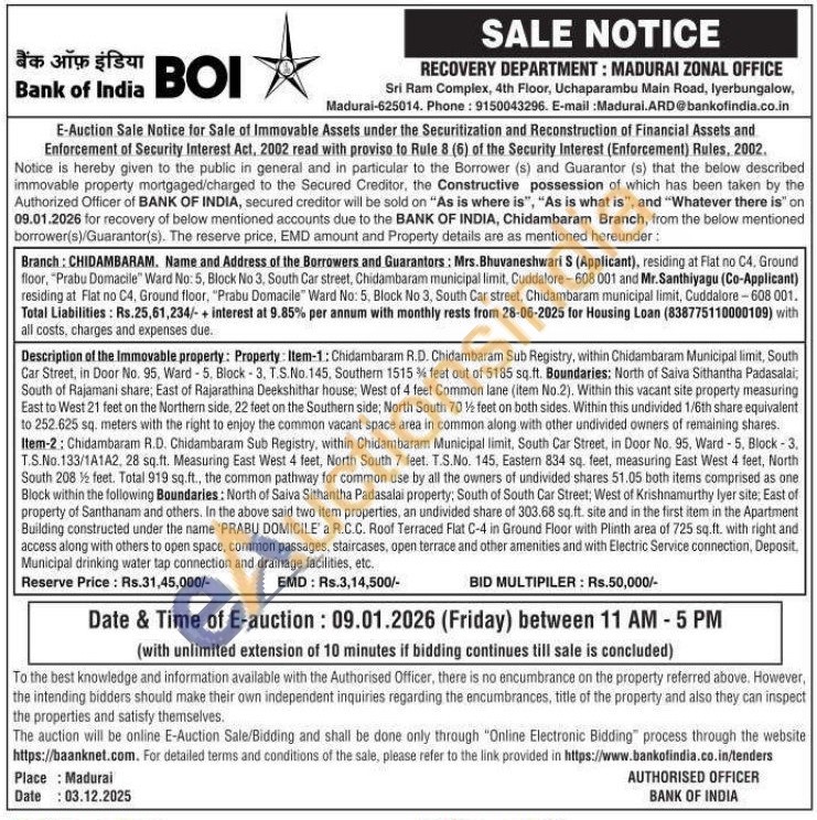 Description of the Immovable property: Property: Item-1: Chidambaram R.D. Chidambaram Sub Registry, within Chidambaram Municipal limit, South Car Street, in Door No. 95, Ward-5. Block 3. T.S.No. 145, Southern 1515 3/4 feet out of 5185 sq.ft. Boundaries: North of Saiva Sithantha Padasalai, South of Rajamani share; East of Rajarathina Deekshithar house, West of 4 feet Common lane (item No.2). Within this vacant site property measuring East to West 21 feet on the Northern side, 22 feet on the Southern side; North South 70 1/2feet on both sides. Within this undivided 1/6th share equivalent to 252.625 sq. meters with the right to enjoy the common vacant space area in common along with other undivided owners of remaining shares. Item-2: Chidambaram R.D. Chidambaram Sub Registry, within Chidambaram Municipal limit, South Car Street, in Door No. 95, Ward-5. Block-3. T.S.No. 133/1A1A2, 28 sq.ft. Measuring East West 4 feet, North South 7 feet. T.S.No. 145, Eastern 834 sq. feet, measuring East West 4 feet, North South 208½ feet. Total 919 sq.ft., the common pathway for common use by all the owners of undivided shares 51.05 both items comprised as one Block within the following Boundaries: North of Saiva Sithantha Padasalai property; South of South Car Street; West of Krishnamurthy lyer site; East of property of Santhanam and others. In the above said two item properties, an undivided share of 303.68 sq.ft. site and in the first item in the Apartment Building constructed under the name 'PRABU DOMICILE' a R.C.C. Roof Terraced Flat C-4 in Ground Floor with Plinth area of 725 sq.ft. with right and access along with others to open space, common passages, staircases, open terrace and other amenities and with Electric Service connection, Deposit, Municipal drinking water tap connection and drainage facilities, etc