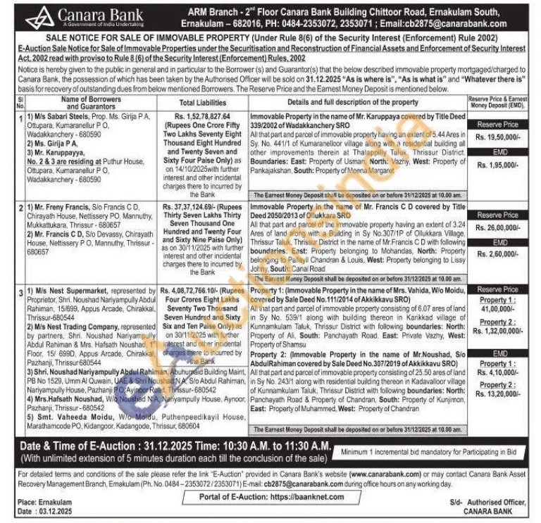 3) Property 1: (Immovable Property in the name of Mrs. Vahida, W/o Moidu, covered by Sale Deed No.111/2014 of Akkikkavu SRO) All that part and parcel of immovable property consisting of 6.07 ares of land in Sy No. 539/1 along with building thereon in Karikkad village of Kunnamkulam Taluk, Thrissur District with following boundaries: North: Property of Ali, South: Panchayath Road, East: Private Vazhy, West: Property of Shamsu