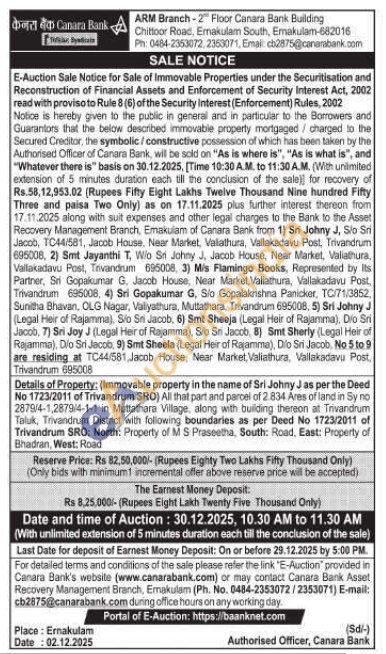 Details of Property: (Immovable property in the name of Sri Johny J as per the Deed No 1723/2011 of Trivandrum SRO) All that part and parcel of 2.834 Ares of land in Sy no 2879/4-1,2879/4-1-1 in Muttathara Village, along with building thereon at Trivandrum Taluk, Trivandrum District with following boundaries as per Deed No 1723/2011 of Trivandrum SRO: North: Property of MS Praseetha, South: Road, East: Property of Bhadran, West: Road