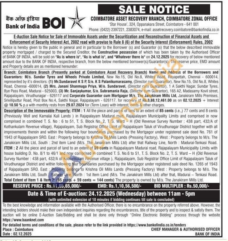 ITEM: 1 All the piece and parcel of land to an extent of 85 cents (i.e.,) 77 cents and 8 cents (Previously Well and Kamalai Kuli Lands) in Rajapalayam Madurai road, Rajapalayam Municipality Limits and comprised in now comprised in combined T. S. No: 6 to 51, T. S. Block No. 2, T. S. Ward-H (Old Revenue Survey Number: 438 part, 432/A of Kothankulam Revenue village), Rajapalayam, Sub Registrar Office Limit of Rajapalayam Taluk of Virudhunagar District together with all improvements therein and within the following four boundaries purchased by the Mortgagor under registered sale deed No. 761 of 1943 of Rajapalayam SRO. East: Property belongs to Krishna Oil Mills Lands (Pressing Factory), West: Property belongs to M/s. The Janakiram Mills Ltd, South: 2nd item Land (M/s. The Janakiram Mills Ltd) after that Railway Line, North Madurai-Tenkasi Road. ITEM: 2 All the piece and parcel of land to an extent of 59 cents in Rajapalayam Madurai road, Rajapalayam Municipality Limits with house building D. No. 8/1 to 46/1 and now comprised in combined T. S. No.6 to 51, T. S. Block No. 2, T. S. Ward-H (Old Revenue Survey Number: 438 part, 432/A of Kothankulam Revenue village), Rajapalayam, Sub Registrar Office Limit of Rajapalayam Taluk of Virudhunagar District and within following four boundaries purchased by the Mortgagor under registered sale deed No. 1265 of 1943 of Rajapalayam SRO. East: Property belongs to Krishna Oil Mills Lands (Pressing Factory) West: Property belongs to M/s. The Janakiram Mills Ltd, South: Railway Line, North 1st Item Land (M/s. The Janakiram Mills Ltd) after that, Madurai Tenkasi Road. Total Extent of Item 1 & Item 2: (85 cents + 59 cents = 144 cents) The property is owned by M/s. The Janakiram Mills Ltd