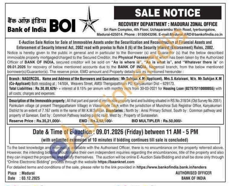 1)All that part and parcel of immovable property land and building situated in RS.No.318/34 (Old Survey No.2051) Painkulam village (at present Thengapattanam Village) in Vilavancode Taluk within the jurisdiction of Munchirai Sub Registrar Office, Kanyakumari District to an extent of 7.167 cents in the name of Mr.K.M.Suhijan. Boundaries: North by: Amsi Primary School, South by: Common pathway and property of Ganesan, East by: Common Pathway leading public road, West by: Property of Gunaseelan.