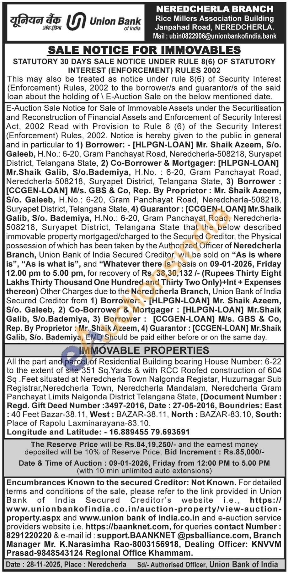 All the part and parcel of Residential Building bearing House Number: 6-22 to the extent of site 351 Sq. Yards & with RCC Roofed construction of 604 Sq. Feet situated at Neredcherla Town Nalgonda Registar, Huzurnagar Sub Registrar, Neredcherla Town, Neredcherla Mandalam, Neredcherla Gram Panchayat Limits Nalgonda District Telangana State, [Document Number: Regd. Gift Deed Number: 3497-2016, Date: 27-05-2016, Boundries: East : 40 Feet Bazar-38.11, West: BAZAR-38.11, North: BAZAR-83.10, South: Place of Rapolu Laxminarayana-83.10.
