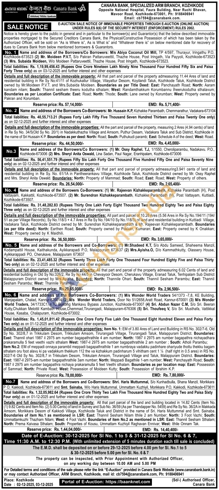 Details and full description of the immovable properties: All the part and parcel of the property, measuring 2 Ares (4.94 cents) of land in Re Sy No. 34/5(Old Sy No. 20/1) in Nadakkuthazha Village and Armsom, Puthur Desam, Vadakara Taluk and Sub District, Kozhikode in the name of Sri Hussain K P. Boundaries as per deed: North: Road; South: Puthukudi paramb; East: Schedule A of the deed; West: Road.
