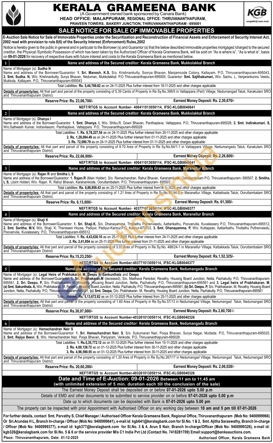 Details of property/ies: All that part and parcel of the property consisting of 1.60 Ares of Property in Re Sy.No.57/13 in Nedumangad Village, Nedumangad Taluk, Nedumangad SRO and Thiruvananthapuram District.